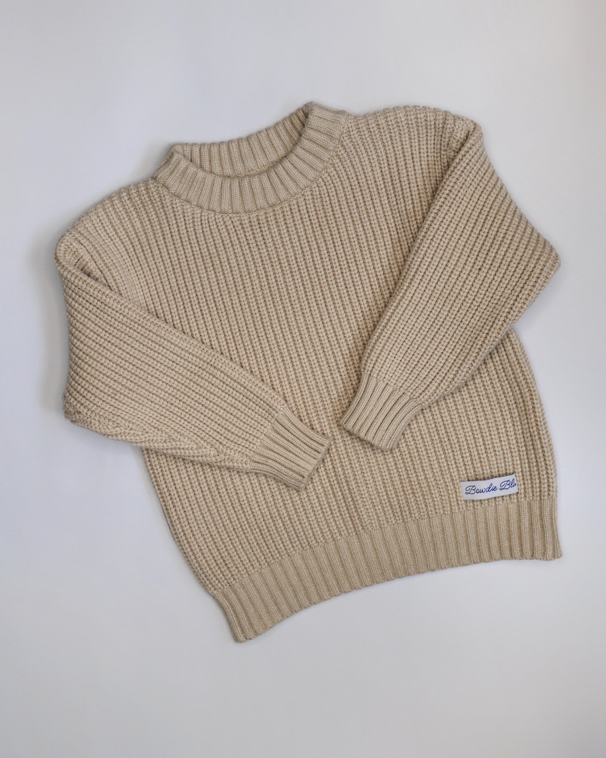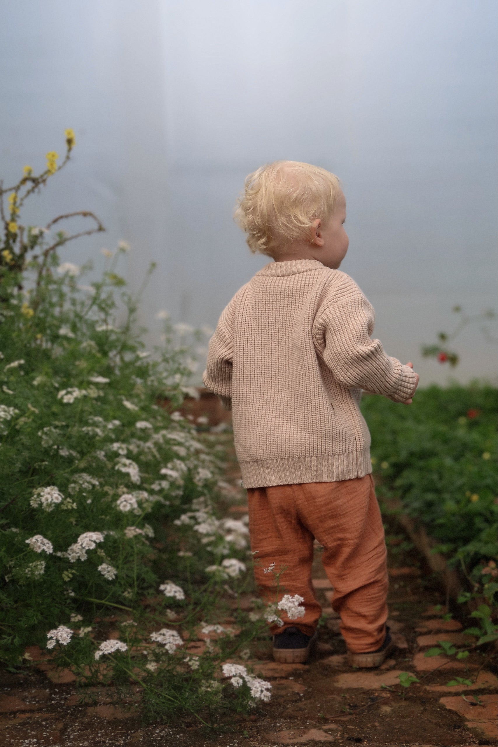 The Sandstone Knit is as cozy as a cuddle and as versatile as they come. In a warm, grounding Sandstone tone, this chunky textured jersey pairs effortlessly with anything from track pants to dungarees. Woven from a soft cotton-blend yarn that’s kind to sensitive skin and finished with a relaxed fit made for easy layering — it’s the kind of piece you’ll reach for again and again.